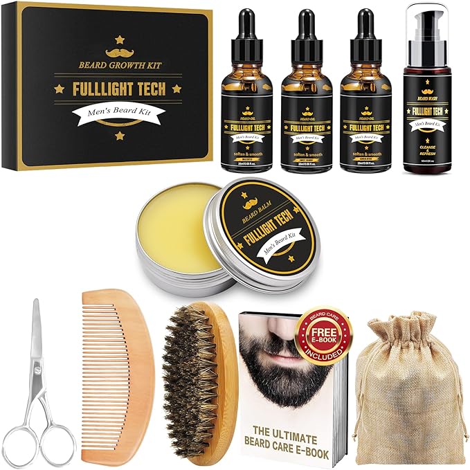 - What’s Included: High-quality beard shampoo, conditioner, growth oil, balm, and a wooden comb, along with stainless steel scissors and a beard brush.